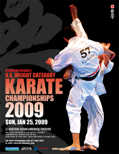 On Sunday, January 25, 2009, the IKO Kyokushinkaikan hosted its annual knockdown tournament, The US Weight Category Karate Championships, in Los Angeles, California. Yet another successful event, this year welcomed over 100 competitors from around the world, including Europe, Asia, and North America. As in previous years, the event was held at the Japan America Theater in Little Tokyo and welcomed over 1,000 spectators to witness competitors challenge themselves and others in this formidable pursuit of strength and spirit.